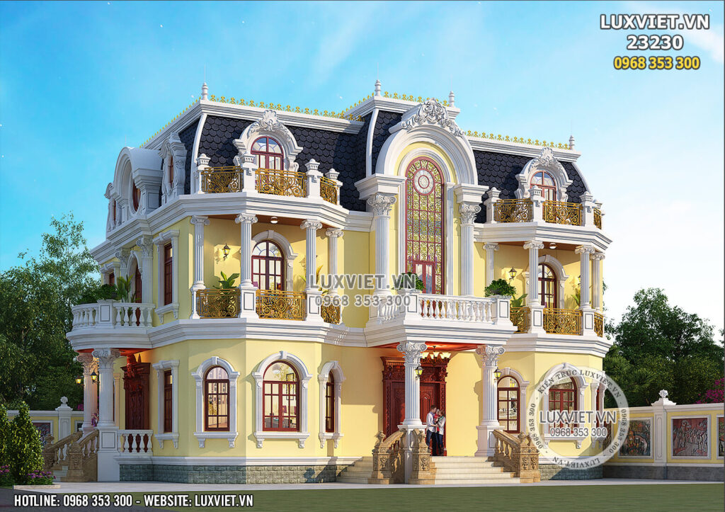 Biệt thự lâu đài kiểu Pháp được xây dựng trên một khu đất khang trang rộng lớn, nơi tâm điểm của mọi ánh nhìn để có thể khoe hết vẻ đẹp cầu kì mĩ miều của toàn bộ ngôi nhà. Vẫn là những là màu sắc quen thuộc, màu vàng, màu trắng và màu xanh của mái kết hợp lại tạo thành một không gian sống hoàng gia với lối kiến trúc Pháp lộng lẫy nguy nga.